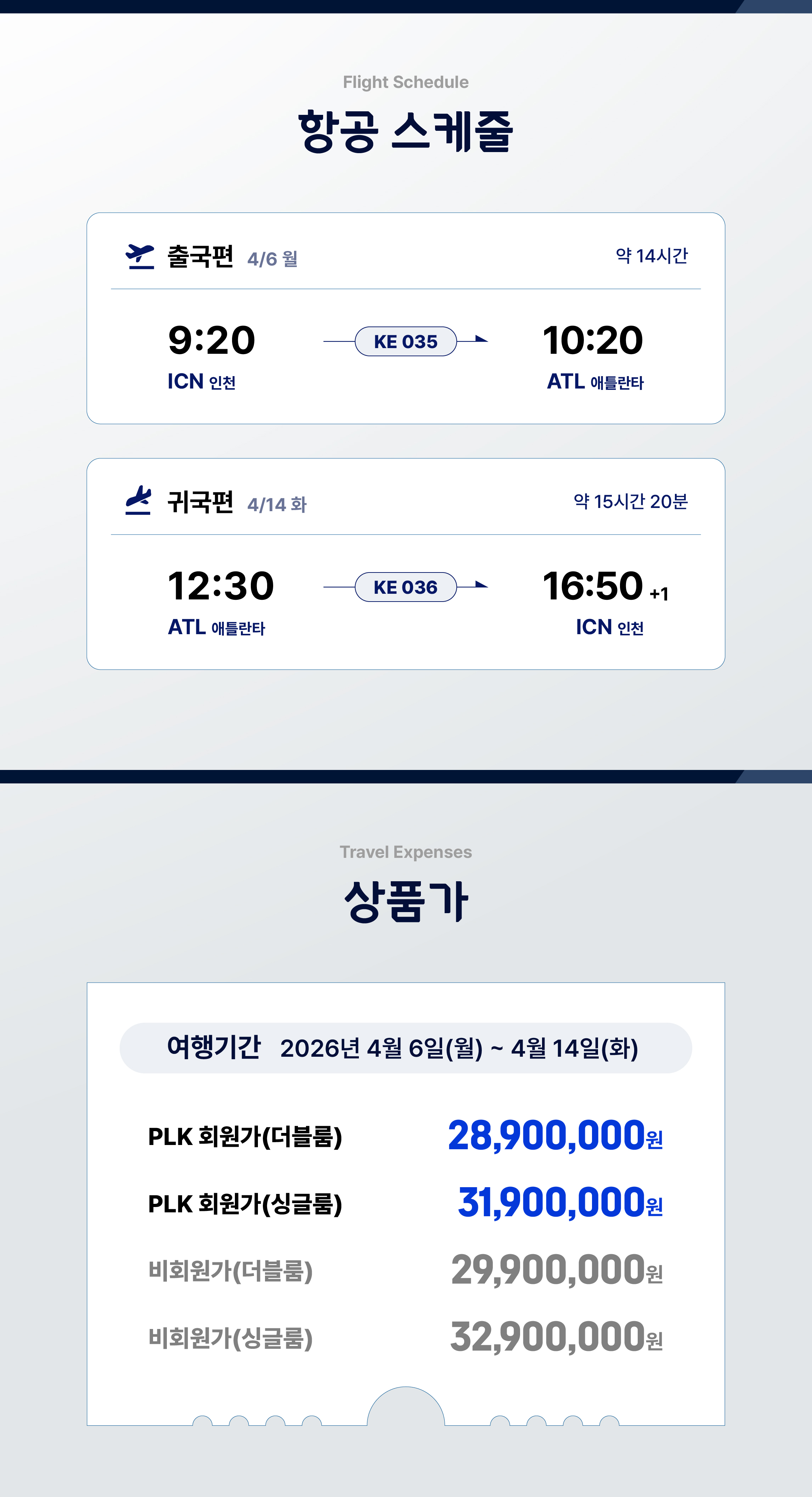 12:30 2026.04.13 월 애틀랜타 출발 16:50 2026.04.14 화 인천 도착 |