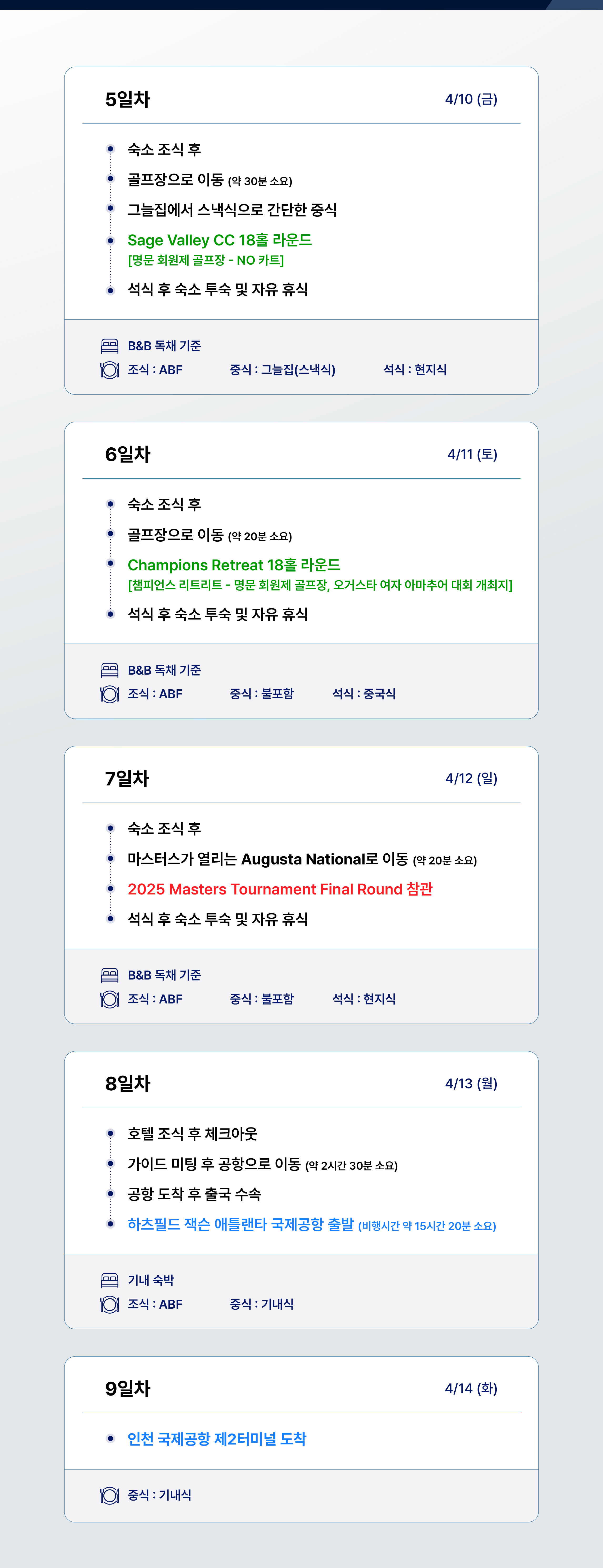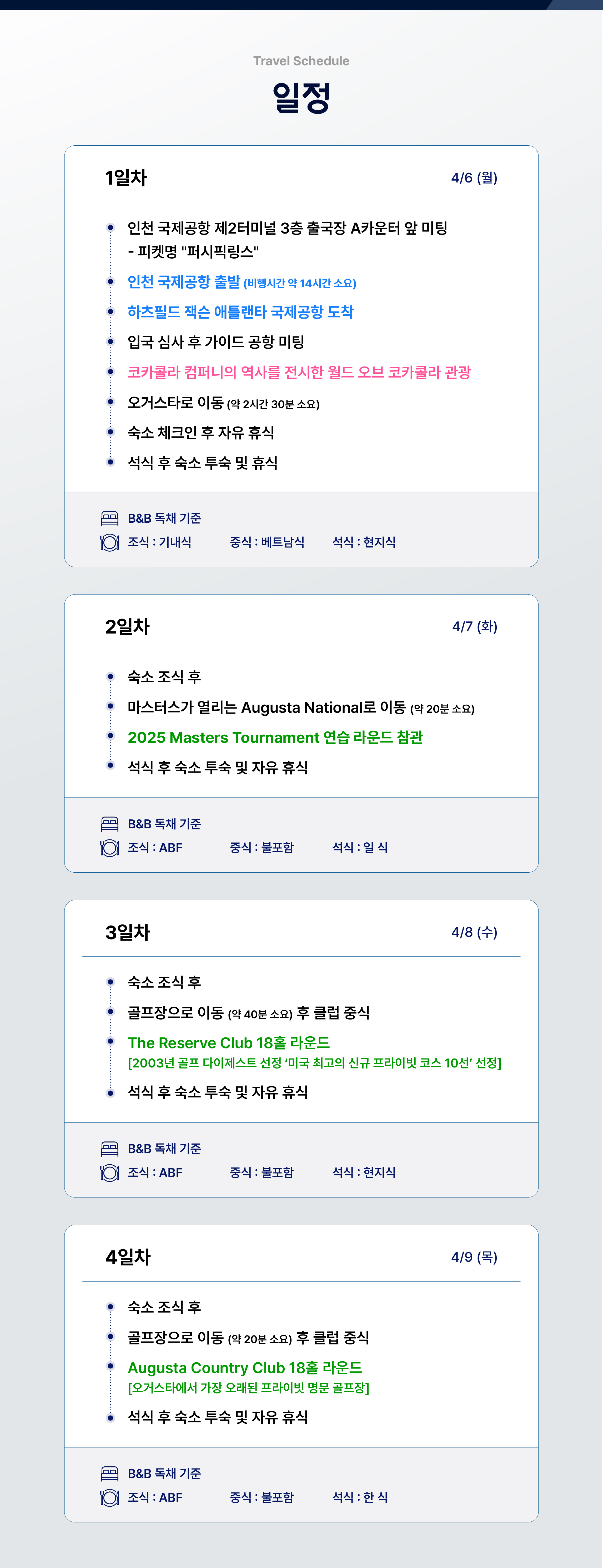 | 포함사항 | * 마스터스 연습라운드+최종전 입장권 * 그린피+카트비(4인1카트) 18홀*3회+그린피 18홀*1회 * 고급 주택 7박(2인1실)+조식 * 전일정 석식 * 전일정 전용차량(14인승 버스 1대)+한국인 가이드 * 3억원 해외 여행자보험 |