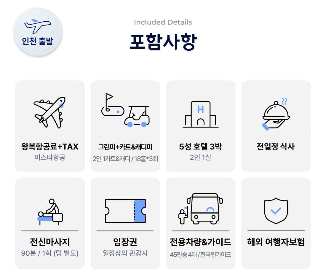 19:30 2026.04.22 수 인천 출발 23:20 2026.04.22 수 푸꾸옥 도착 귀국 상세 일정 직항 | 총 비행시간 : 5시간 40분