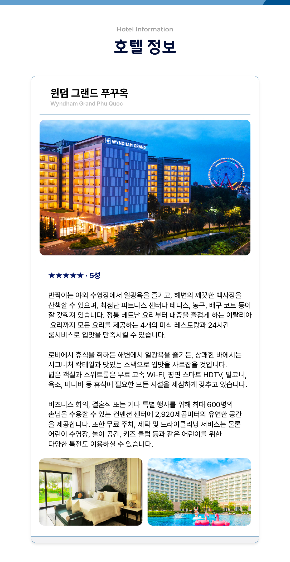 | HOTEL : 윈덤 그랜드 호텔 또는 동급 (5성급 / 2인1실) *주소: Bai Dai Area, Ganh Dau Commune, Phu Quoc, Kien Giang, Vietnam *전화번호: +84-297-3699-999 |