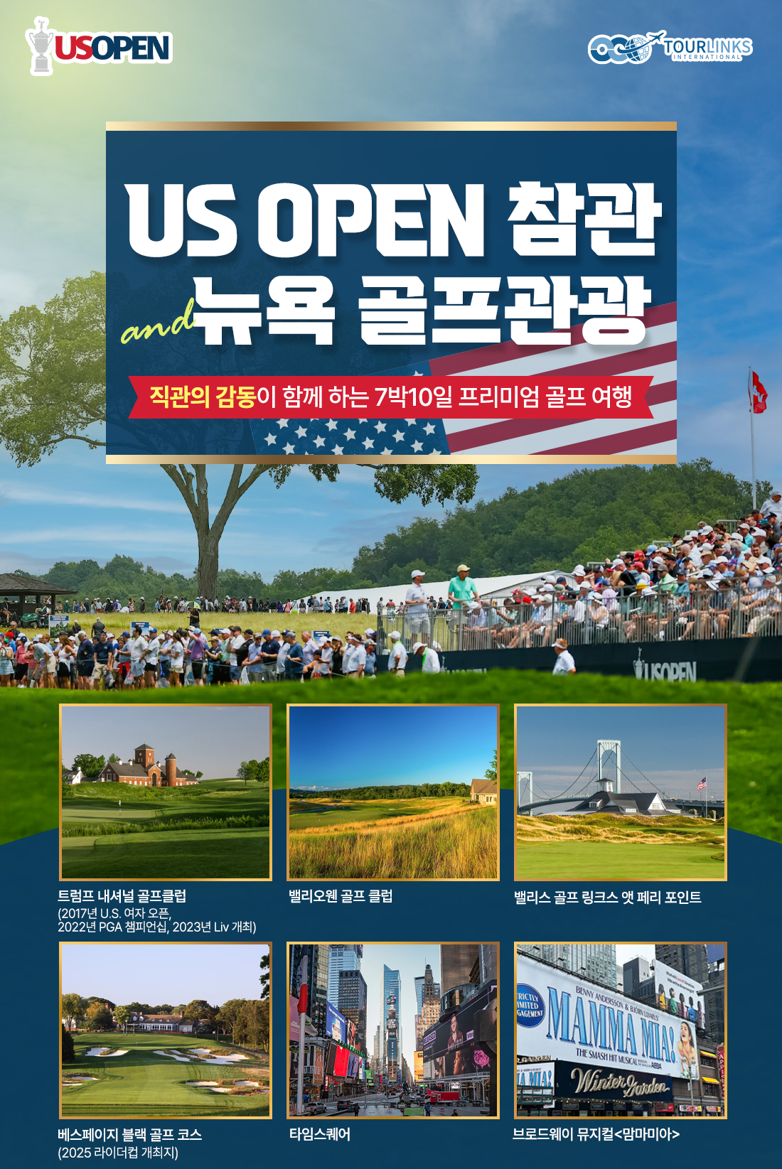 | 포함사항 | • US오픈 최종전(Champions Pavilion) 입장권 • 4성급 호텔*7박 (2인1실/조식포함) • 석식 포함 • 전용차량 (스프린터 15인승)+한국인 가이드 (1일 10시간 이용 기준) • 그린피+카트비(그린피 18홀*5회+카트비 18홀*4회) • 일정에 포함된 관광지 입장료 • 기사&가이드 팁 • 해외 여행자보험 • 골프백 항공커버 등 기념품 제공 |